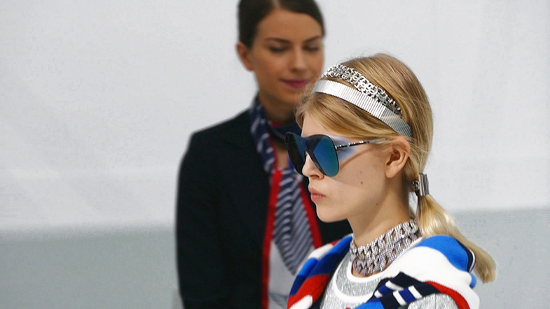 Dai colori della Flagship Airlines, i colori della bandiera francese, i colori delle nuvole e dei riflessi argentati del cielo, la collezione ha mostrato degli angeli e tante declinazioni degli elementi del cuore Chanel, in una forma divertente e per certi versi irriverente, come i grandi occhiali da sole, o le valigie CHANEL, o le mascherine celesti sugli occhi di queste modelle molto più vicine a degli angeli che a delle donne terrene.