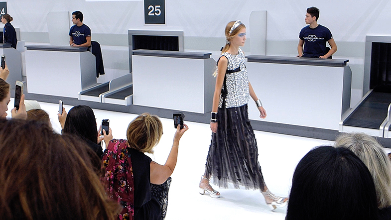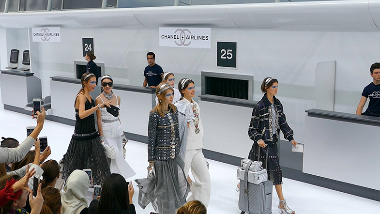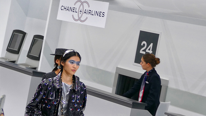 Karl Lagerfeld ha immaginato signore in attesa di prendere un volo, insieme a piloti con splendide divise CHANEL AIRLINES, attraversare l’aeroporto, in cerca del gate di imbarco, raccontando un‘ immaginario ecosistema “CHANEL” come un pianeta su cui poter atterrare e a cui a tutti è possibile accedere attraverso le sue creazioni.